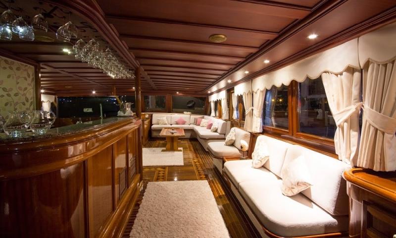 The gulet Afroditi with a total capacity of 14 people, which you can choose for the Bodrum blue cruise routes, has 7 double cabins, 4 of which are master, 1 VIP and 2 twin cabins. Each cabin has a separate shower and toilet. Our boat is air conditioned and each room has a separate air conditioning unit. The boat is 33 meters long and has a total of 4 crew on board. Thanks to the experienced staff of the boat, our yacht charter customers have the opportunity to have a comfortable holiday. There is a large dining table as well as comfortable seating on the back deck of the Aphroditi boat.