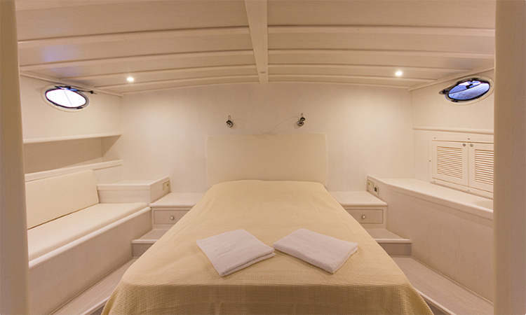 Mini boat has 1 Master, 2 Double cabins layout. The Mini gulet, which has 3 cabins in total, offers blue cruise and yacht charter services up to maximum 6 people.