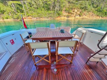 Motor yacht Hadron Princess 60 is registered at the Gocek port and provides boat rental opportunities to our guests in the bays in Turkey region. Hadron Princess 60 yacht has 2x800 Hp Man power main engine. The air contiditon is Available on the boat. Daily charter prices for motor yacht for rent Hadron Princess 60 vary between 950 Euro in low season and 1250 Euro in high season.