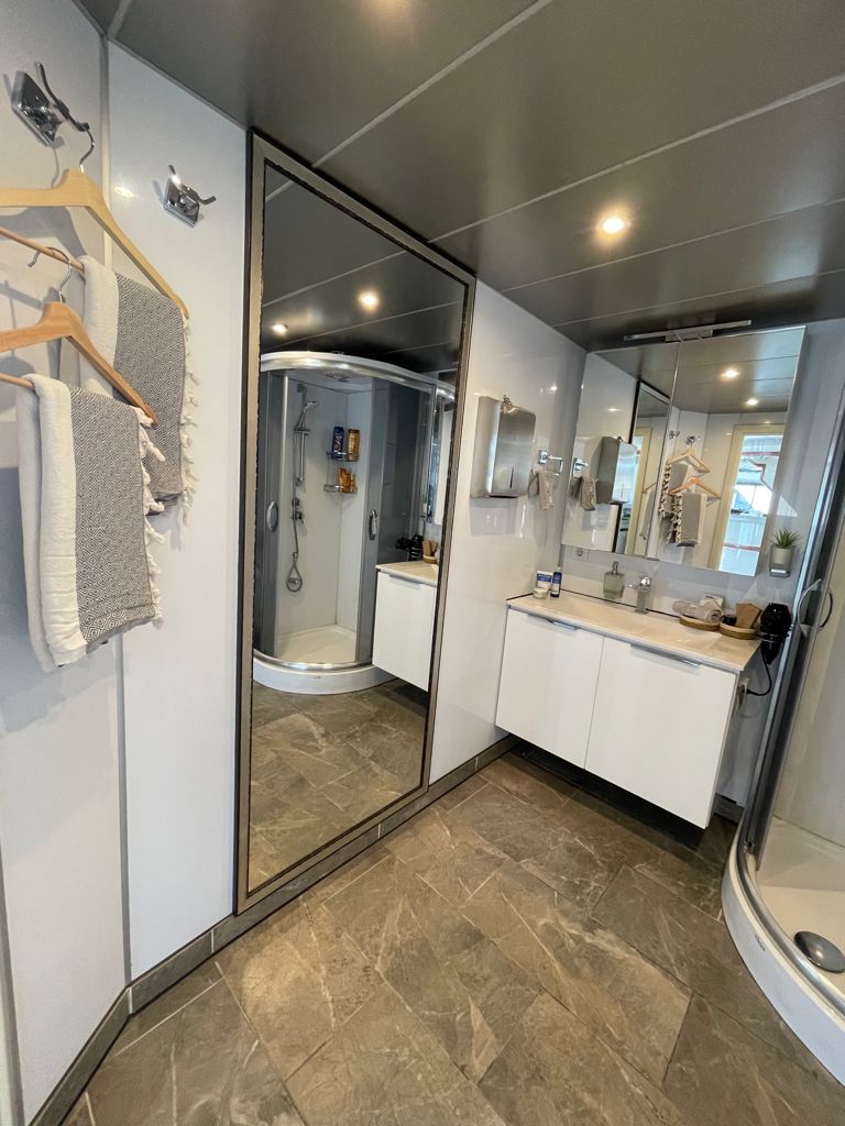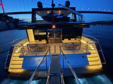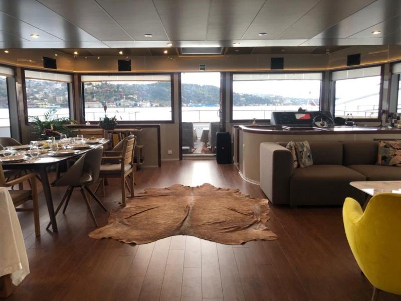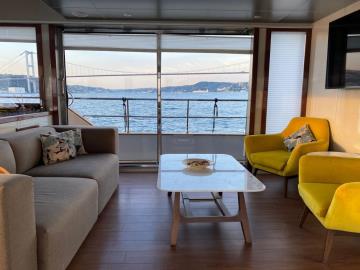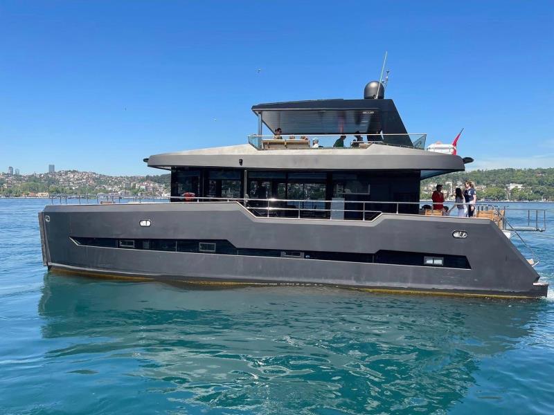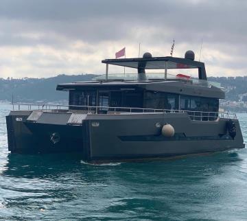 This boat is 17 meters long, 8.50 meters wide, and was launched in November 2019, but started operating in 2021. The living room usage area is 56 square meters in total. Additionally, a total of 35 square meters of flybridge can be used above the lounge. The boat has a steel hull. 2x400 Hp Daewoo main machines are available. Apart from this, 2 generators, 2 Max power ct 255 bow thrusters, 11 solar panel systems, mastervolt gel battery group 1000ah, 2 mastervolt combi 3550, air conditioning system in each room, kitchen and living room, webasto heating system, 400lt/hour watermaker. , camera system, fire alarm system, co2 explosion fire extinguishing system are available. It also has fully decorated furniture and a kitchen service system. There are 3 cabins and 2 WC on the boat. Boat capacity is 36 people in total.