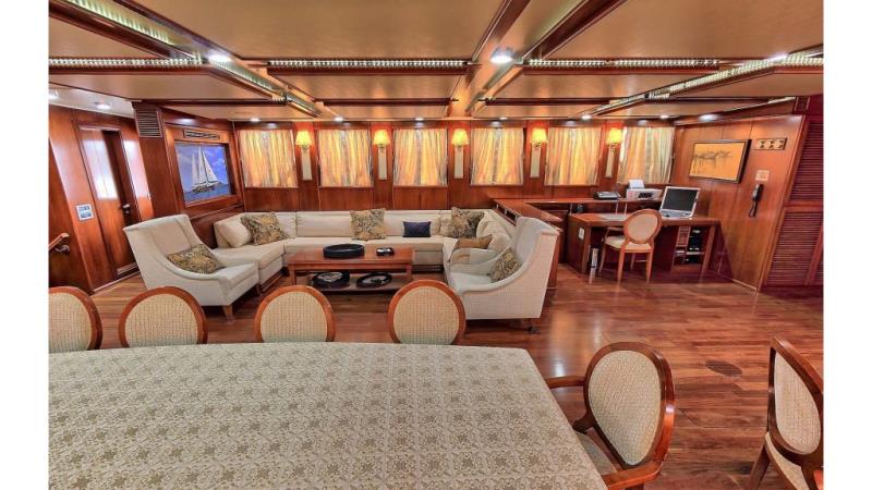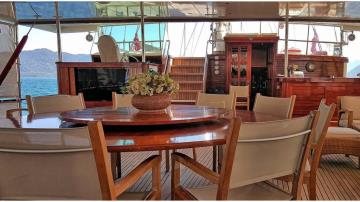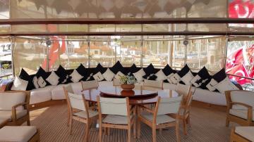 85 m2 aft deck area with dining table for guests, steering console, aft cushions
