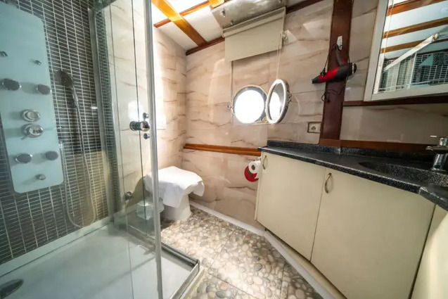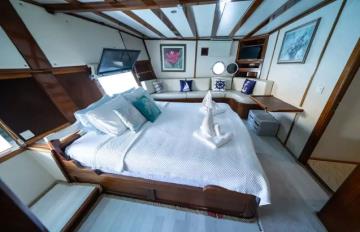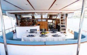 There are also 3 crew cabins. It offers a very large area with its wide body and flybridge. There is a large lounge, very spacious and large guest cabins. Extensive renovations (refits) were carried out in 2019 and 2023.