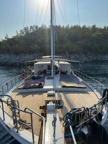 Built in 1993 and extensively renovated in 2023, the double machine was designed as a 25 meter long and 7 meter wide gulet. It offers both an aesthetic and solid structure with its wooden hull. It is equipped with 2 197 HP Delfin engines and a Perkins generator. It has the capacity to accommodate a total of 18 guests thanks to its 9 double cabins.